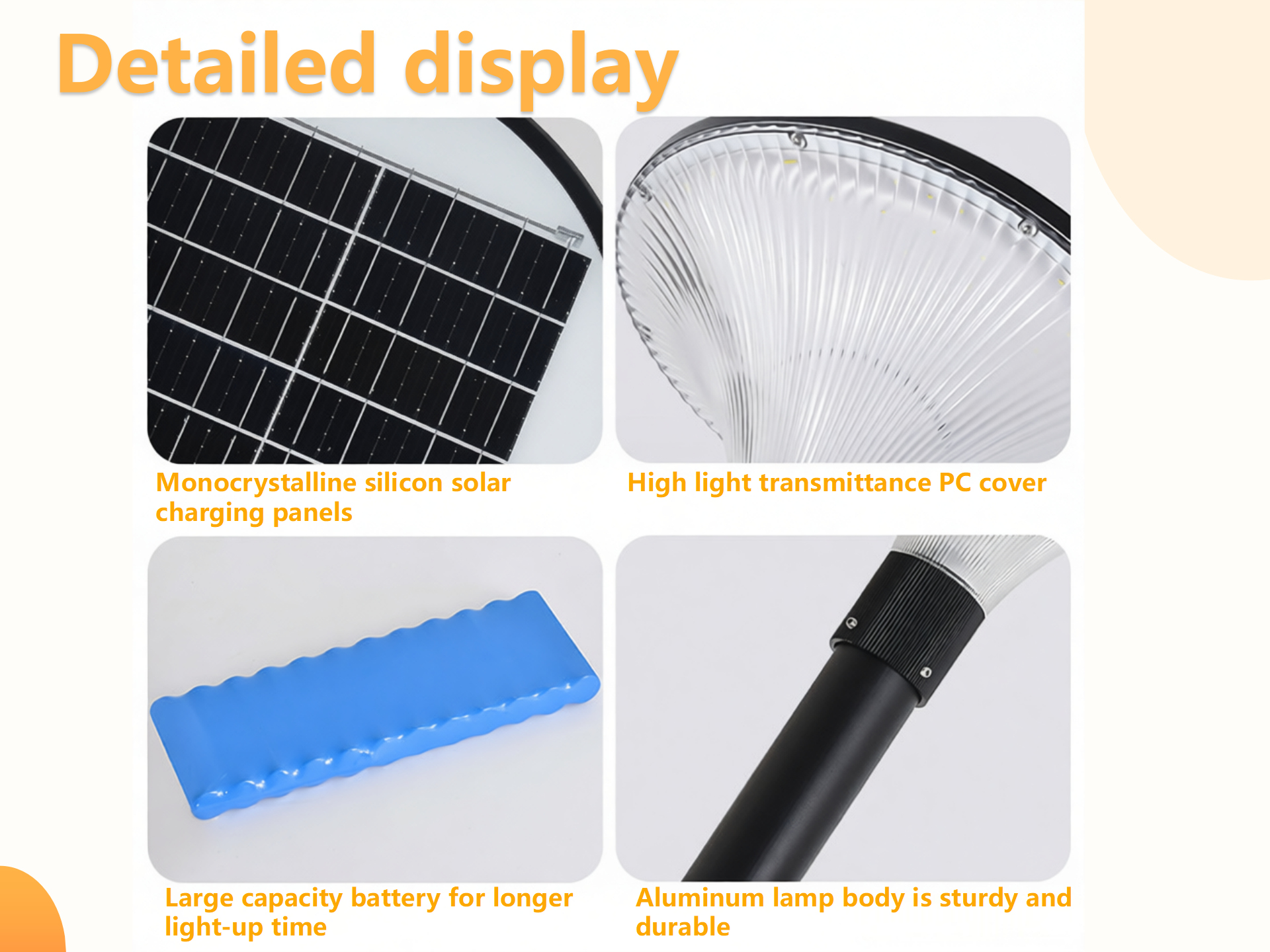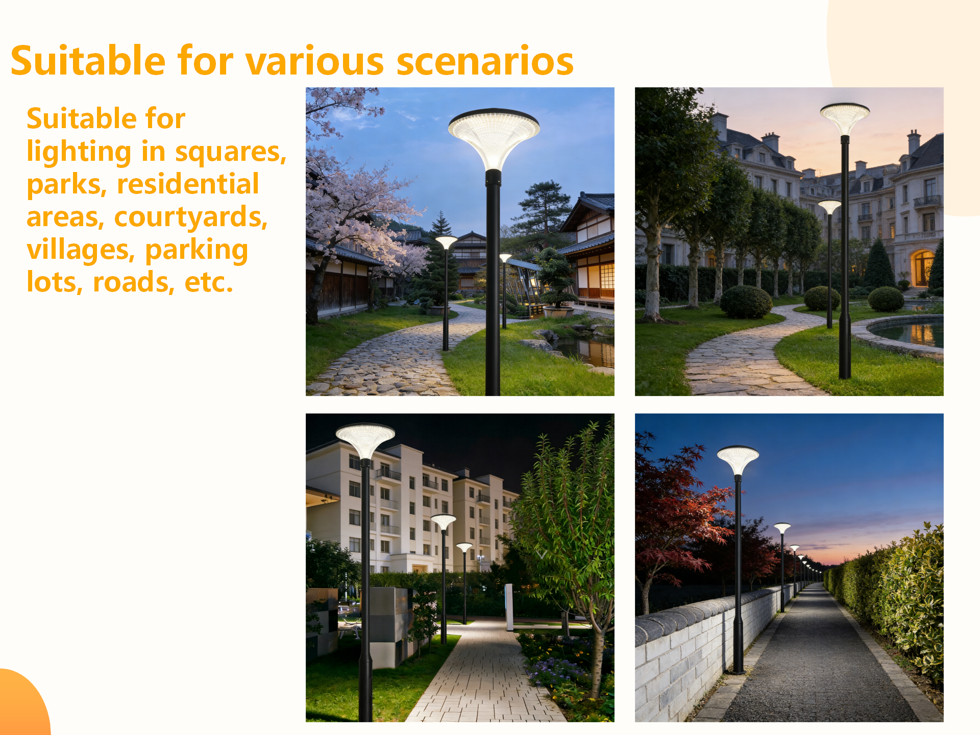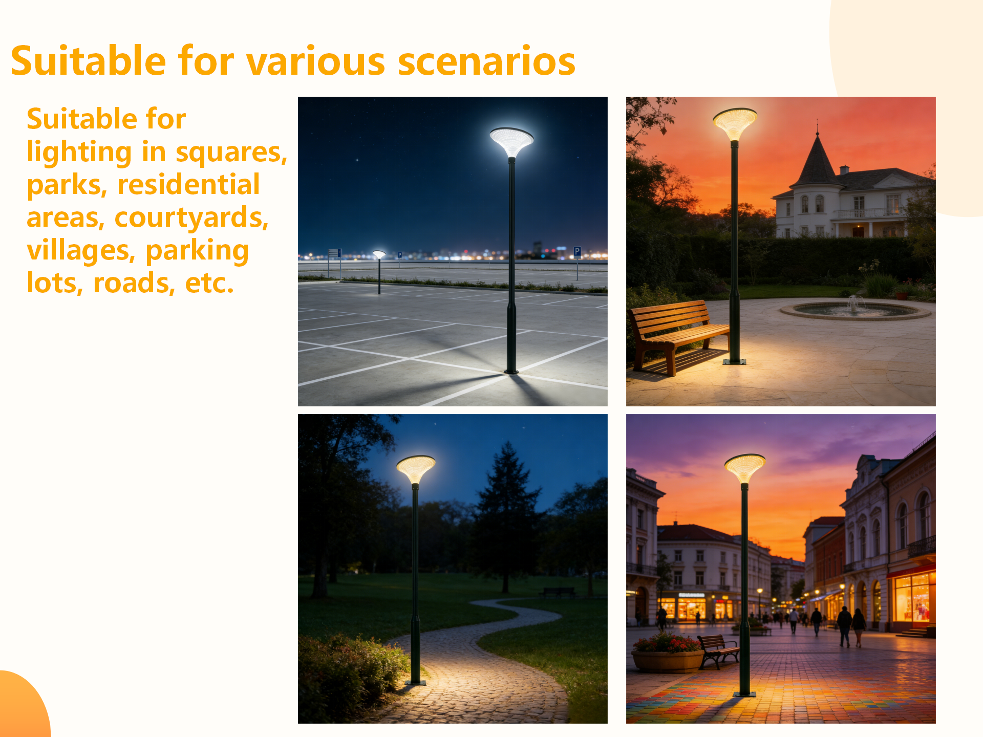 Usage scenarios:Parks, residential areas, courtyards, streets, parking lots, squares, etc.
